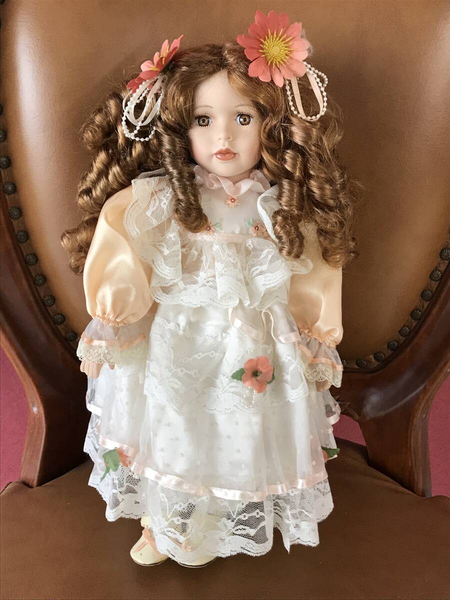 > G8108 Porcelain Doll 約38cm ドール 女の子 栗色 ドレス オレンジ系 陶器製 ビスクドール 西洋人形 置物 オブジェ アンティーク