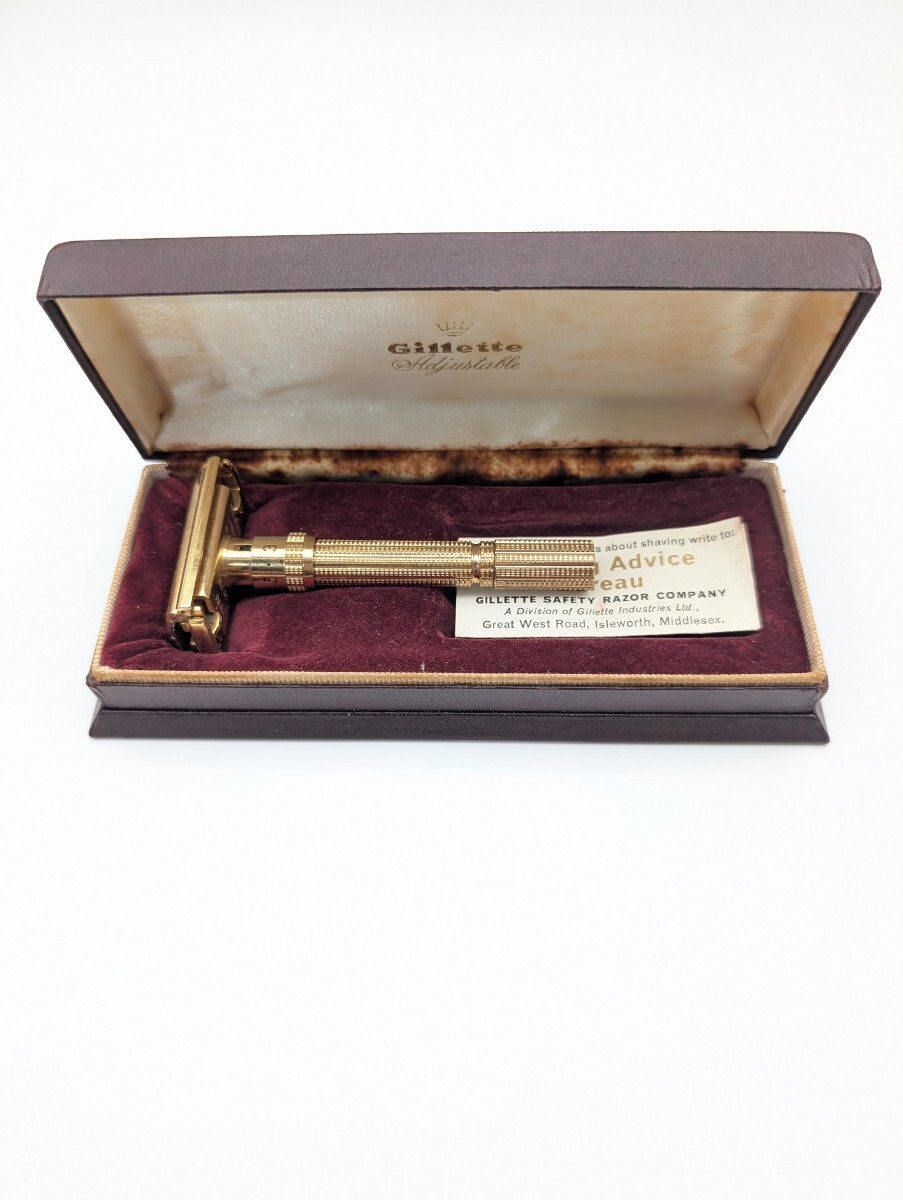 > アンティーク*Gillette Adjustable 替え刃無し 髭剃り ジレット カミソリ T字 RAZOR USA ヴィンテージ 箱付 ゴールド