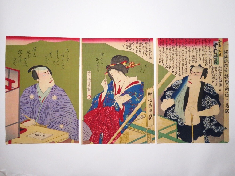 - 【10545】江戸~明治 木版画/浮世絵 周重 人物図 3枚綴り(初品・買取品)