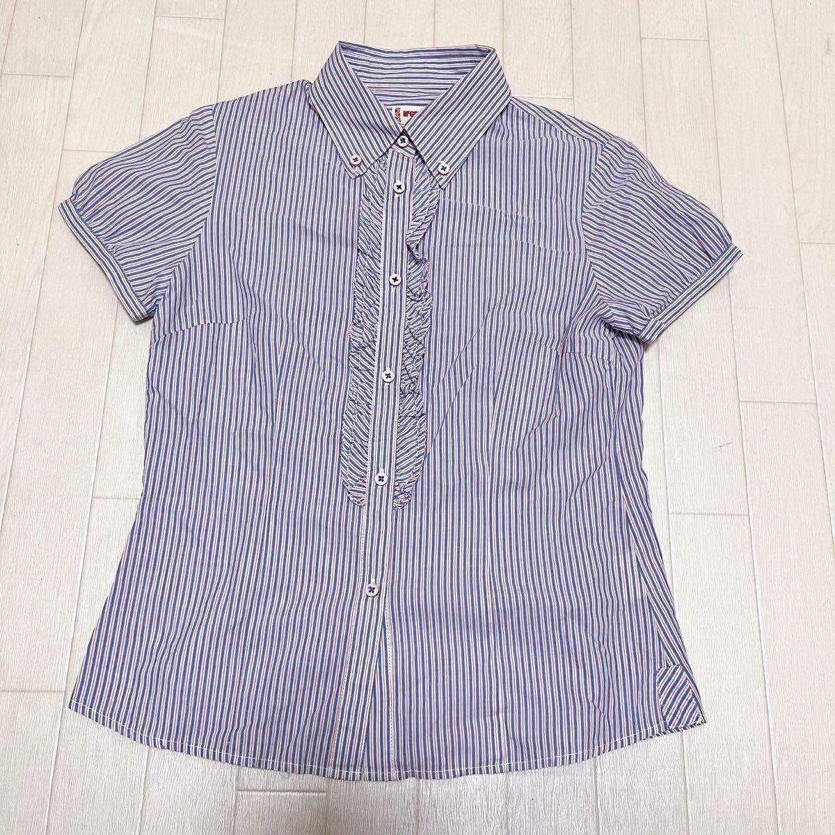 > 和762★ McGregor マックレガー 半袖 ボタンシャツ ストライプ フリル ボタンダウン カジュアル 9 ブルー レッド レディース