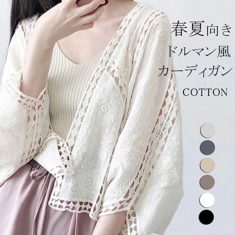 - カーディガン レディース 夏 羽織 羽織り 羽織もの 透ける 透け彫り 綿 コットン ドロップショルダー ドルマン 体型カバー ボレ
