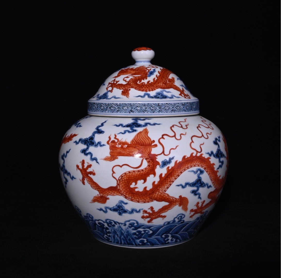 - TM6#3137【3.1】中国骨董 人間国宝 磁器【大明成化年制青礬紅竜紋蓋缶】工芸品 施釉陶 青花磁 陶芸 精美彫 置物 收藏品