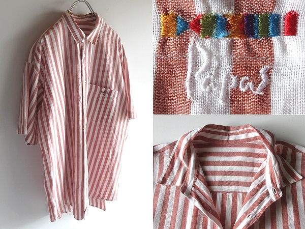 - 高級 Papas パパス ロゴ刺繍 コットンリネン 半袖 シャツ ストライプシャツ L テラコッタ ホワイト 日本製 ネコポス対応