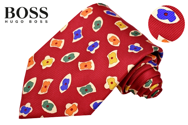 > N-3029★送料無料★BOSS HUGO BOSS ボス ヒューゴボス★正規品 イタリア製 ポップなレッド赤色 小紋パターン柄 花柄 シルクネクタイ