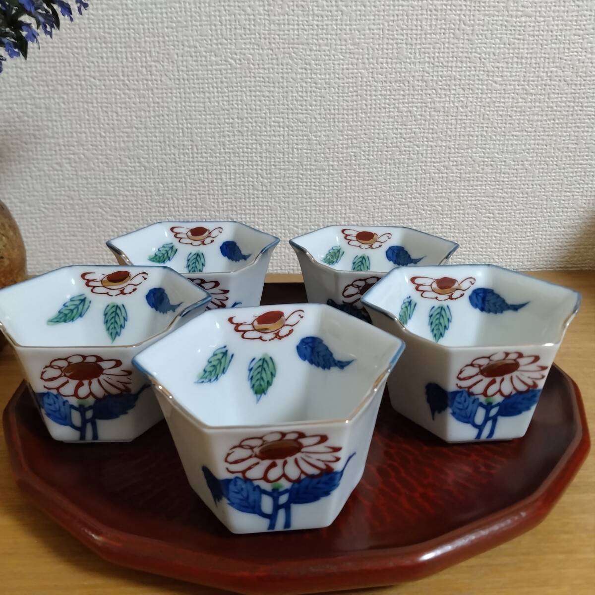- 壽山 六角変形小鉢 五個セット 6角 箱なし 花柄 金彩