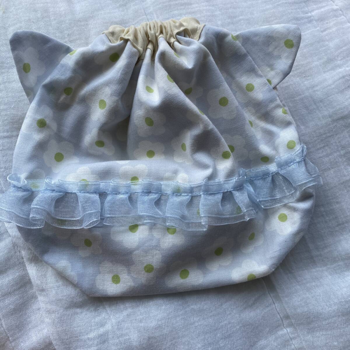 - ハンドメイド 猫耳巾着 水色花柄レース付き