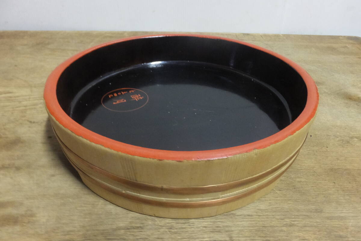 - ■ こ-87 寿司桶 中古 内側:うるし塗り タガ:銅 酔月 飯台 約寸:高7cm 幅27cm 厚さ1cm 重さ400g