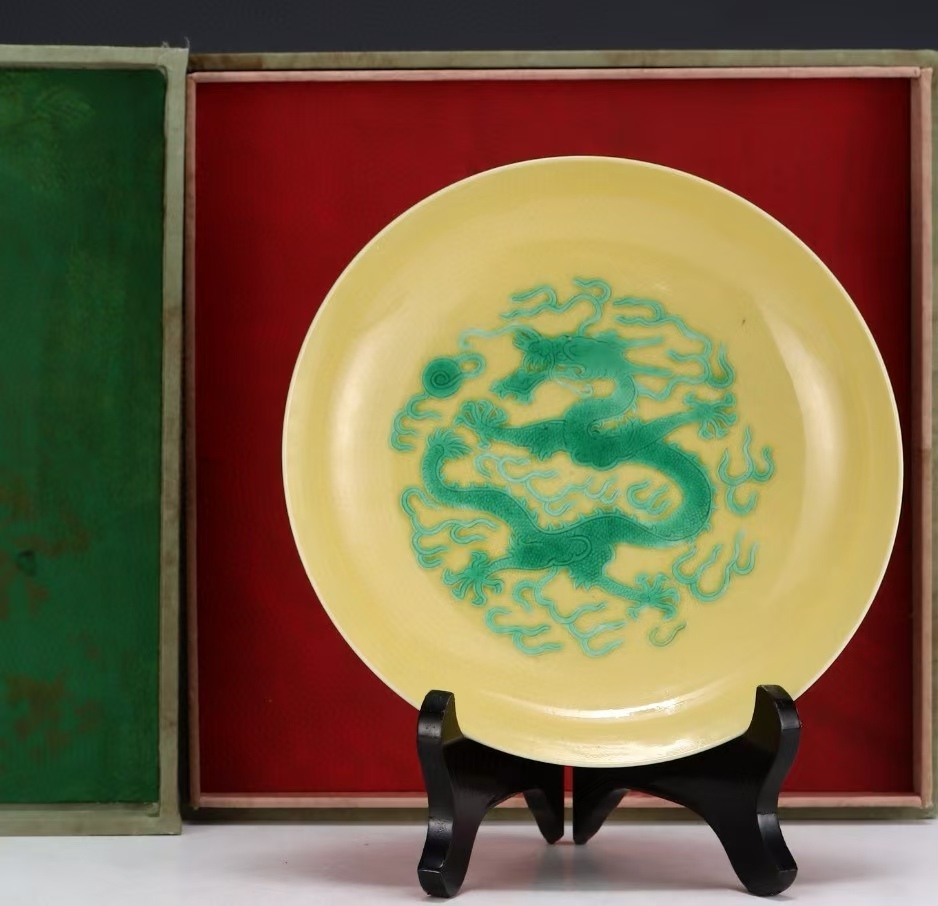- 皿 磁器 秘藏 大清嘉慶年制 帝王黄釉緑彩龍紋皿 酒器 茶器 唐磁 染付 陶磁器 收蔵品 古美味 時代物 古美術 古置物 希少珍品 中國文玩6.23