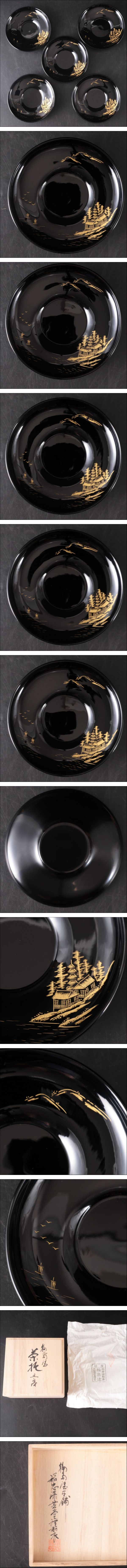 - ◆◇輪島塗 稲忠漆芸堂 山水楼閣文茶托 5客 能登輪島 漆器 茶道具 共箱◇◆