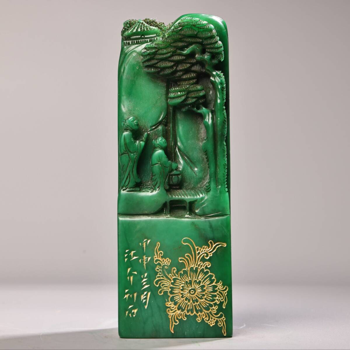- 蔵友旧蔵出 寿山石 綠田黄石 細密彫 老人攜童印章 箱付 貴重品 稀少物品 置物 賞物 中国時代美術品