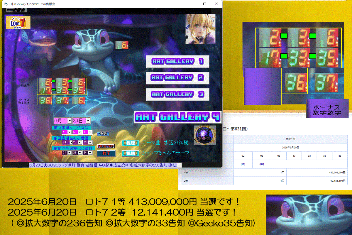 - 新作 ロト7予想ソフト『ロト7Geckoジェンマ2025』2025年6月20日 ロト7 1等 413,009,000円 強い役で当選です♪タイムセール
