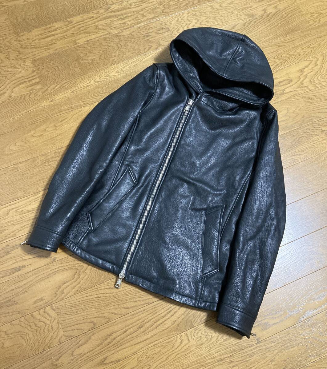 - 美品 [AKM] 22SS 定242,000 DEER SHRINK SHEEP WRAP HOODED ラップフード レザージャケット ライダース L 羊革 ブラック B411 エーケーエム