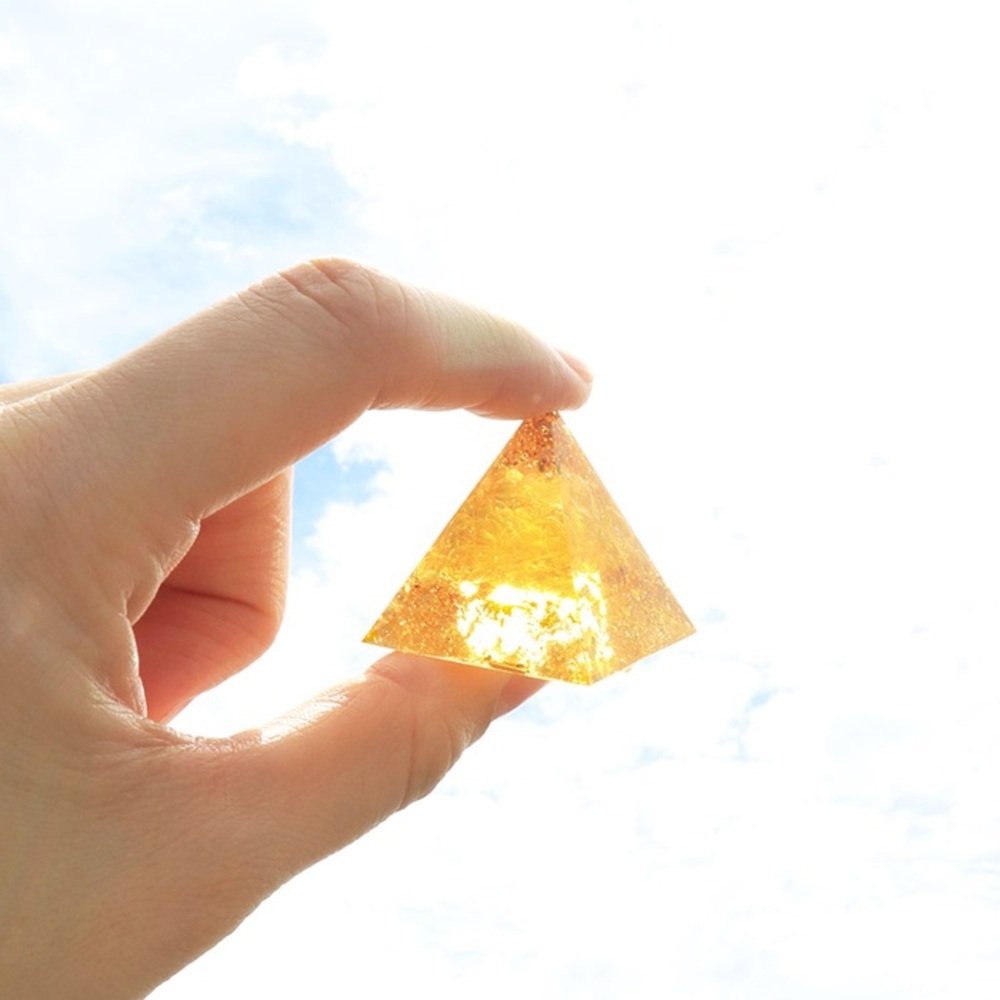 - ☆ オレンジ ☆ ゴールドラメ&パワーストーン入りピラミッド型オブジェ ピラミッド オブジェ サン宝石 置物 おしゃれ シトリン 金運