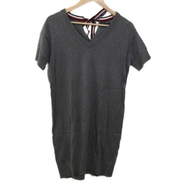 - トミーヒルフィガー TOMMY HILFIGER サイズS - グレー レディース Vネック/半袖/ひざ丈/ニット/リボン ワンピース