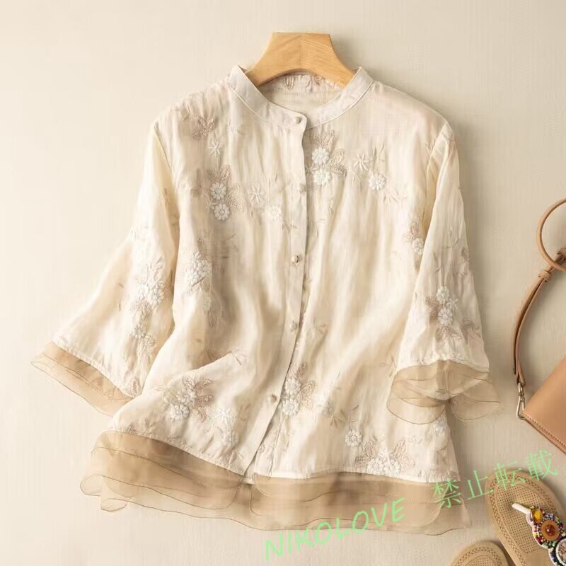 > 新品ブラウス レディース 七分袖シャツ 綿麻シャツ チュニック 刺繍 上品トップス オシャレ 開襟 きれいめ 通気性M~XXL LC789