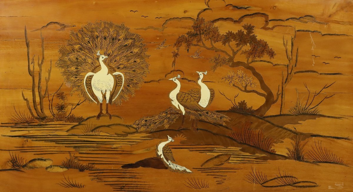 ・マルケットリー 寄木細工 孔雀 壁掛け画 /象嵌細工 木工美術 板絵