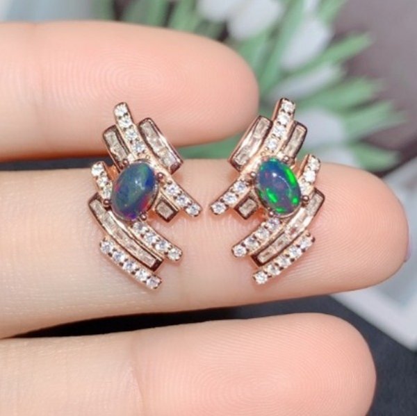 ブラックナチュラルオパール ピアス、4x6mm、925シルバー、 女性用 デイリーウェア