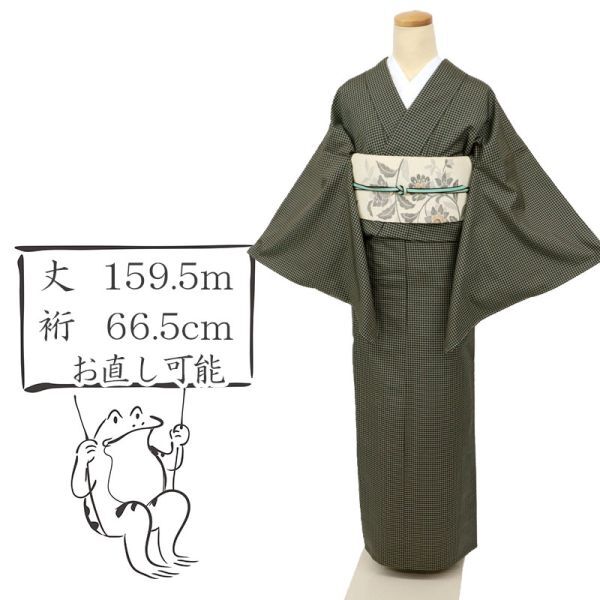 > 【紬】 単衣 ますいわ屋謹製 細やか格子に浮き織り 黒緑色 正絹着物 TG5-1