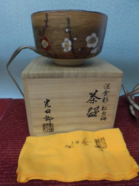 - ★石崎光四郎/泥金彩紅白梅/茶碗/共箱★