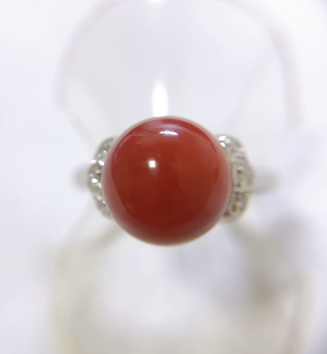 - 【質屋 尾張屋商店 東京】 ☆鑑別結果付☆ Pt900 天然珊瑚 ダイヤモンドリング レディース #10