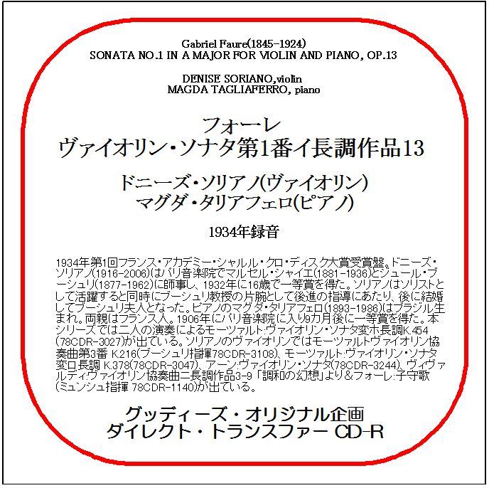 - フォーレ:ヴァイオリン・ソナタ第1番/ドニーズ・ソリアノ/送料無料/ダイレクト・トランスファー CD-R
