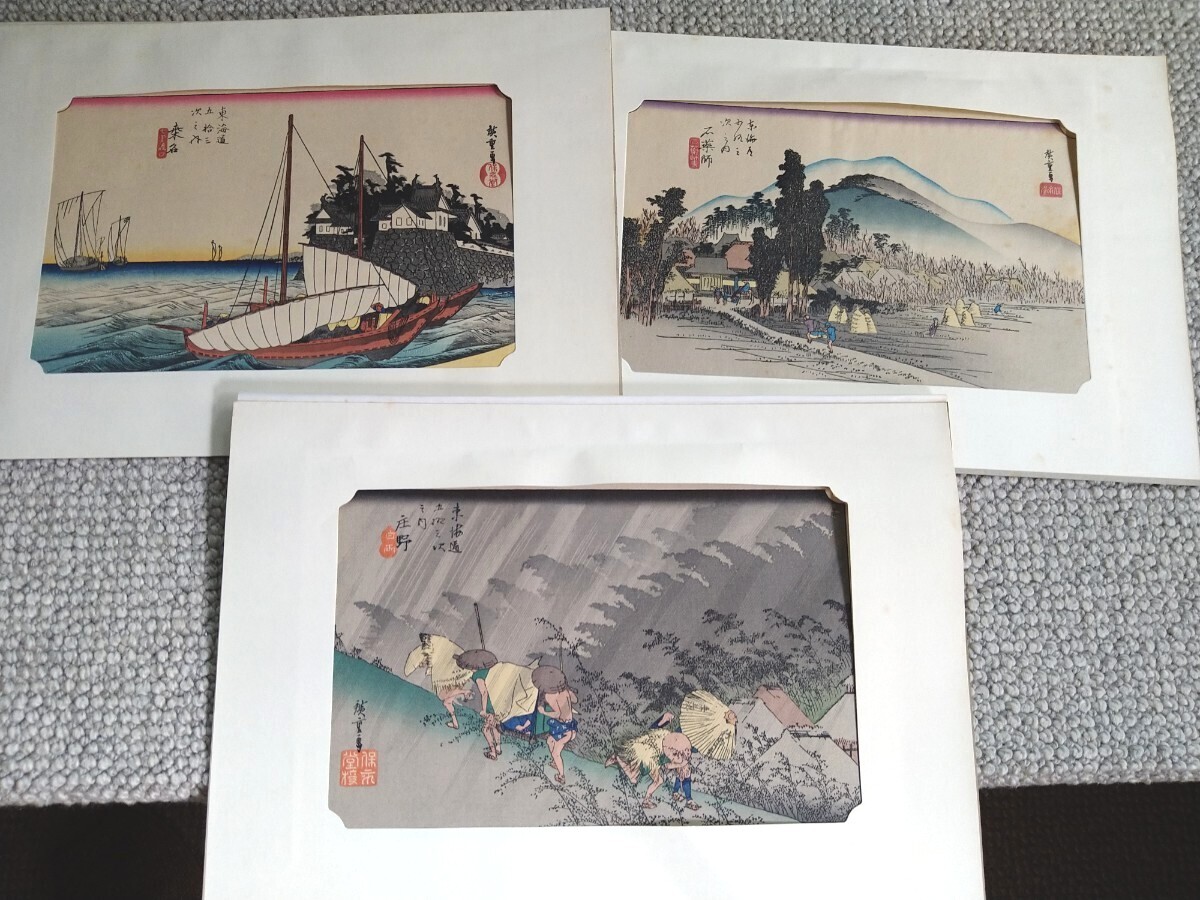 - 【木版刷 浮世絵3点セット】歌川広重 東海道五十三次 「桑名 七里渡口」「石薬師 石薬師寺」「庄野 白雨」高見沢研究所 真作 べらぼう 蔦重