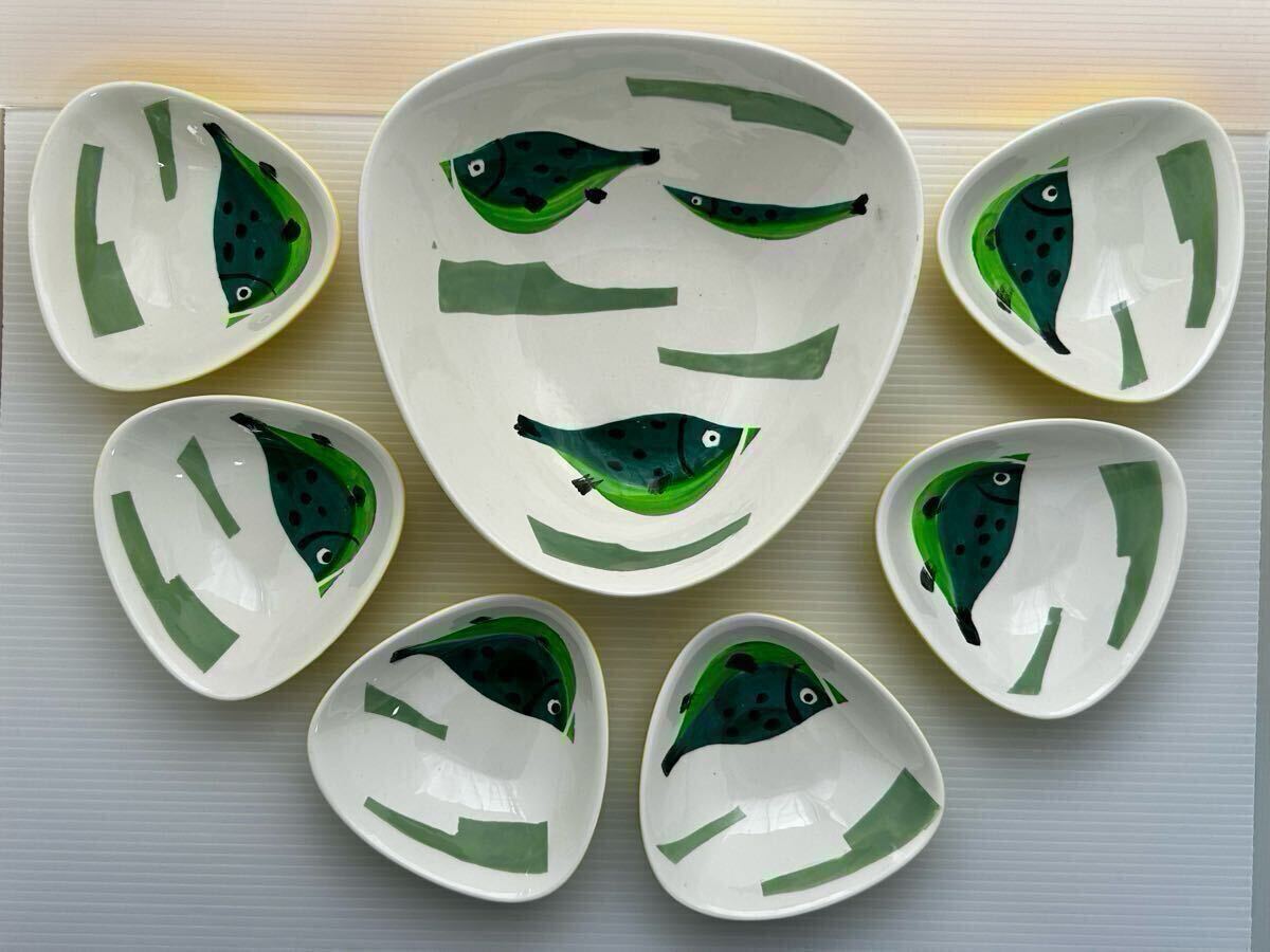 > 昭和レトロ 希少 Seyei セーエー陶器 三角形魚柄 大鉢小鉢6 セット 黄色 イエロー Fine Seyei CHINA NAGOYA JAPAN ヴィンテージ 〈K-55〉