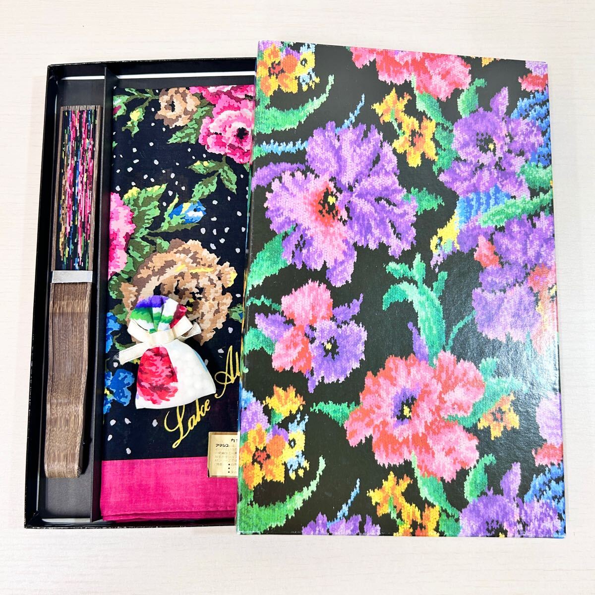 > ★未使用品★ Lake Alster レイクアルスター 扇子 ハンカチ にほひ袋 カワサキ 綿100% カネボウ バラ柄 シェニール織り (07057E
