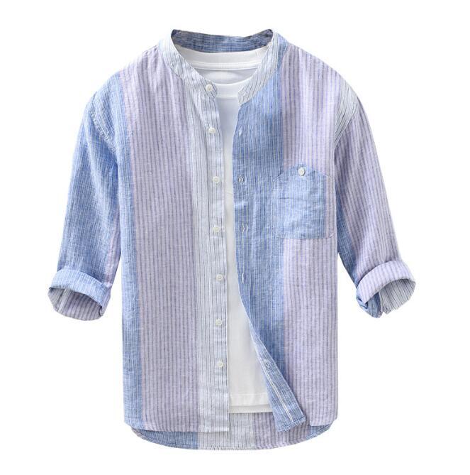 - 新入荷七分袖シャツ メンズ ストライプ柄 切替 リネンシャツ メンズシャツ 麻100% トップス Tシャツ 薄手 紳士 カジュアル 春夏 清涼感 XL