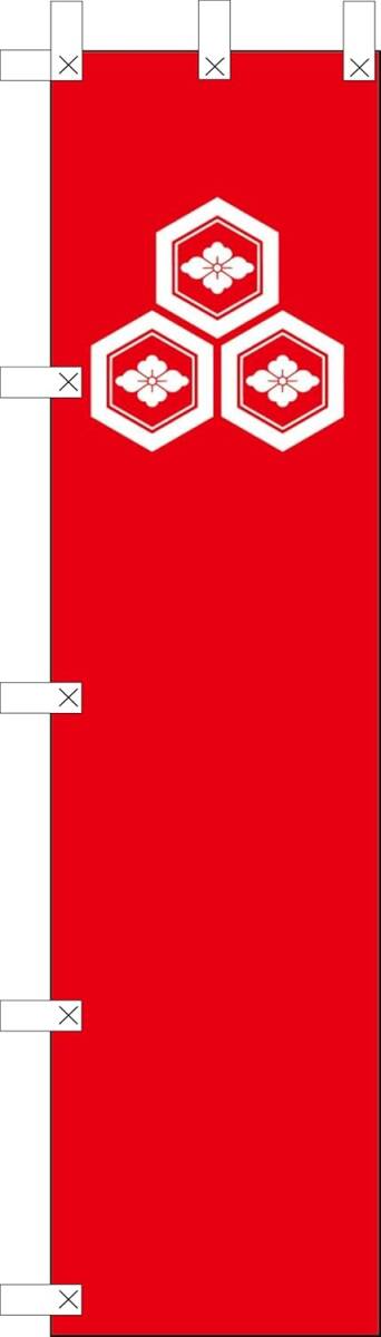 > のぼり「直江兼続 のぼり旗 直江兼続 幟旗 赤白【三つ盛亀甲に三つ葉】 家紋 戦国武将 兼続 前立て 愛軍旗 兼続 三つ山軍旗 E」送料360円