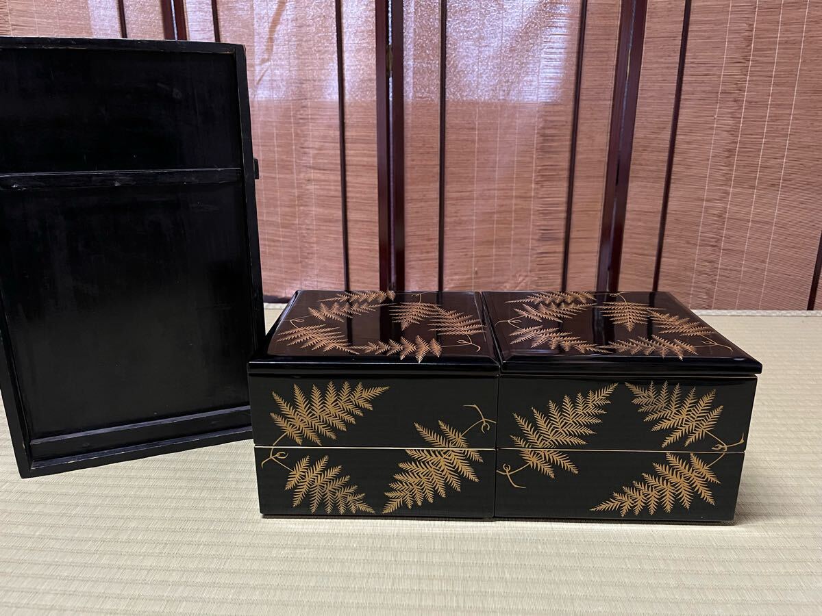 - 金蒔絵 シダ蒔絵 四段重箱 梨地 蒔絵 漆器 漆芸 木製漆器 箱付き 時代物