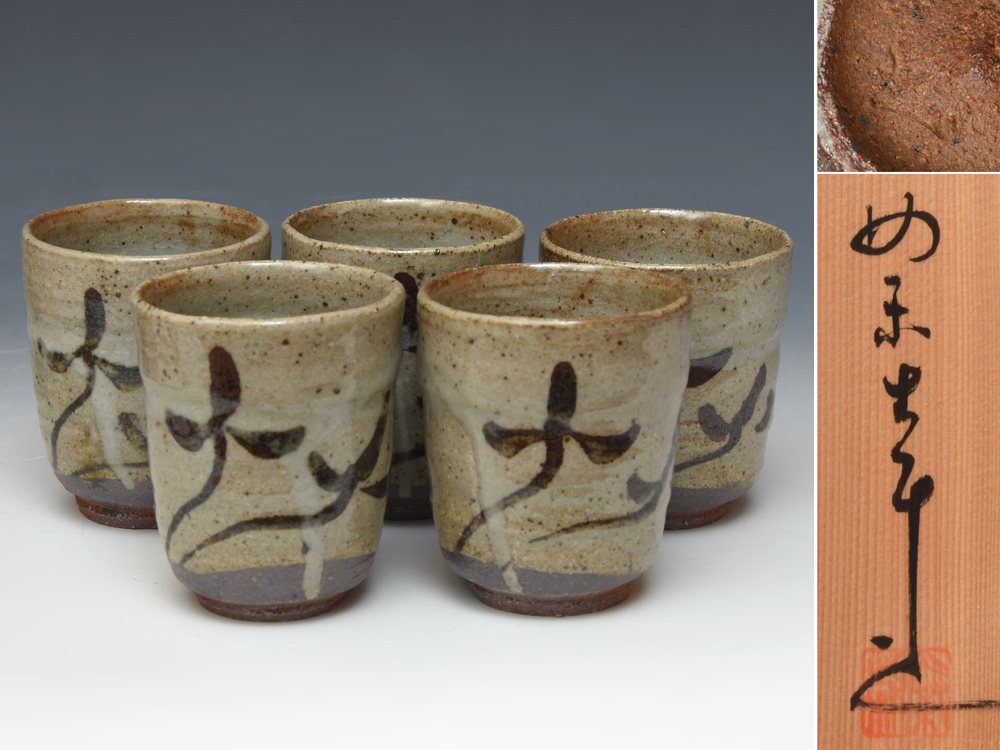 - 土平窯 藤ノ木土平 (造) 絵唐津 組湯呑 5客揃い 共箱 未使用 しおり 陶磁器 酒器 唐津焼 u0497o