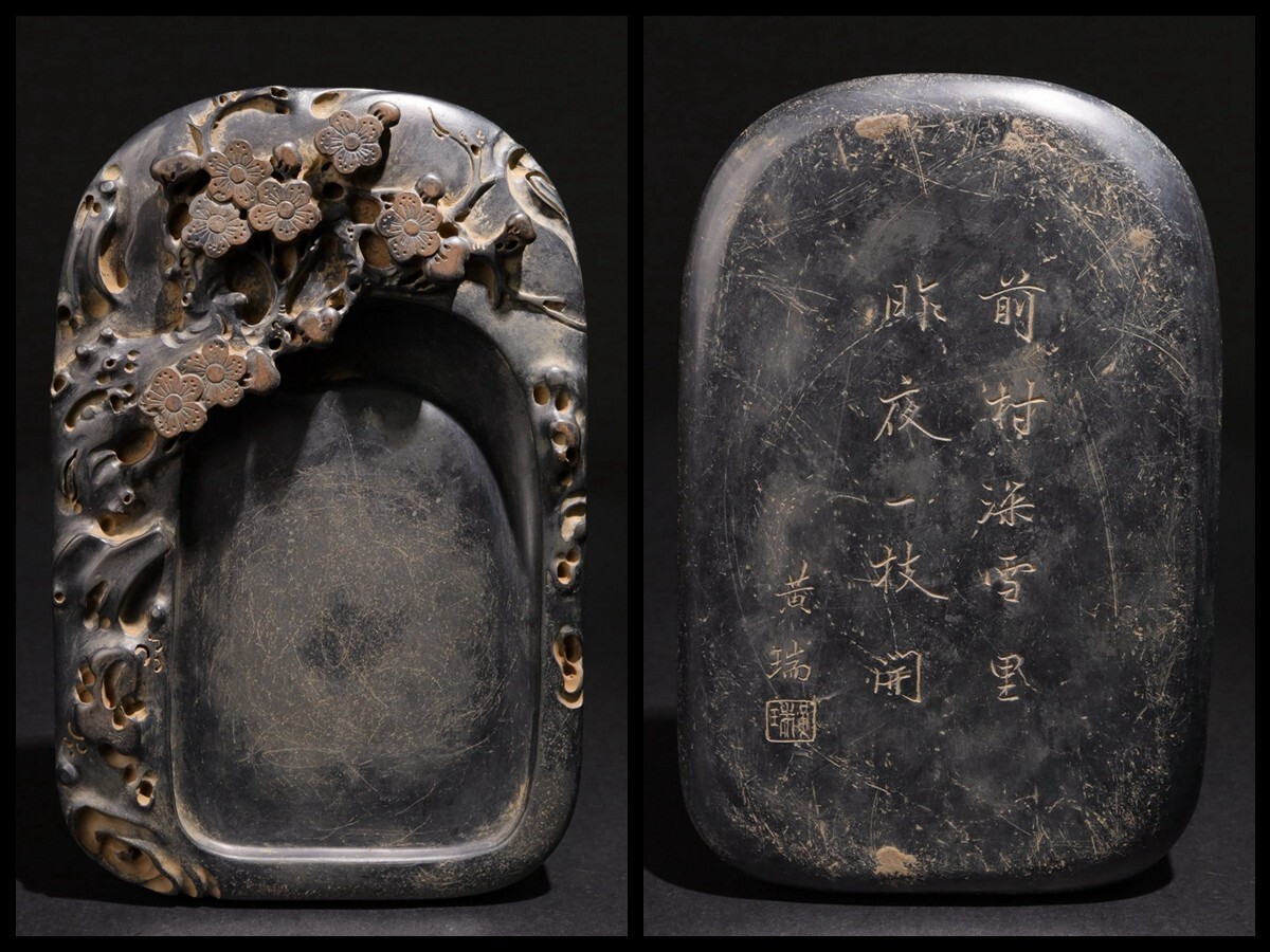 - 「古歙石硯 梅花香自苦寒来文房歙硯 黄瑞銘 清時代」手彫り 文房四宝 書道具 中国古美術 旧蔵出