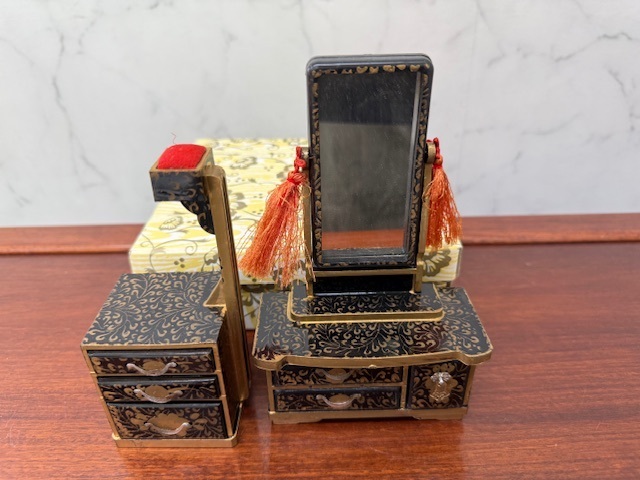 - 古い雛道具 ひな道具 金蒔絵 中型対鏡 針箱 鏡台 雛飾り