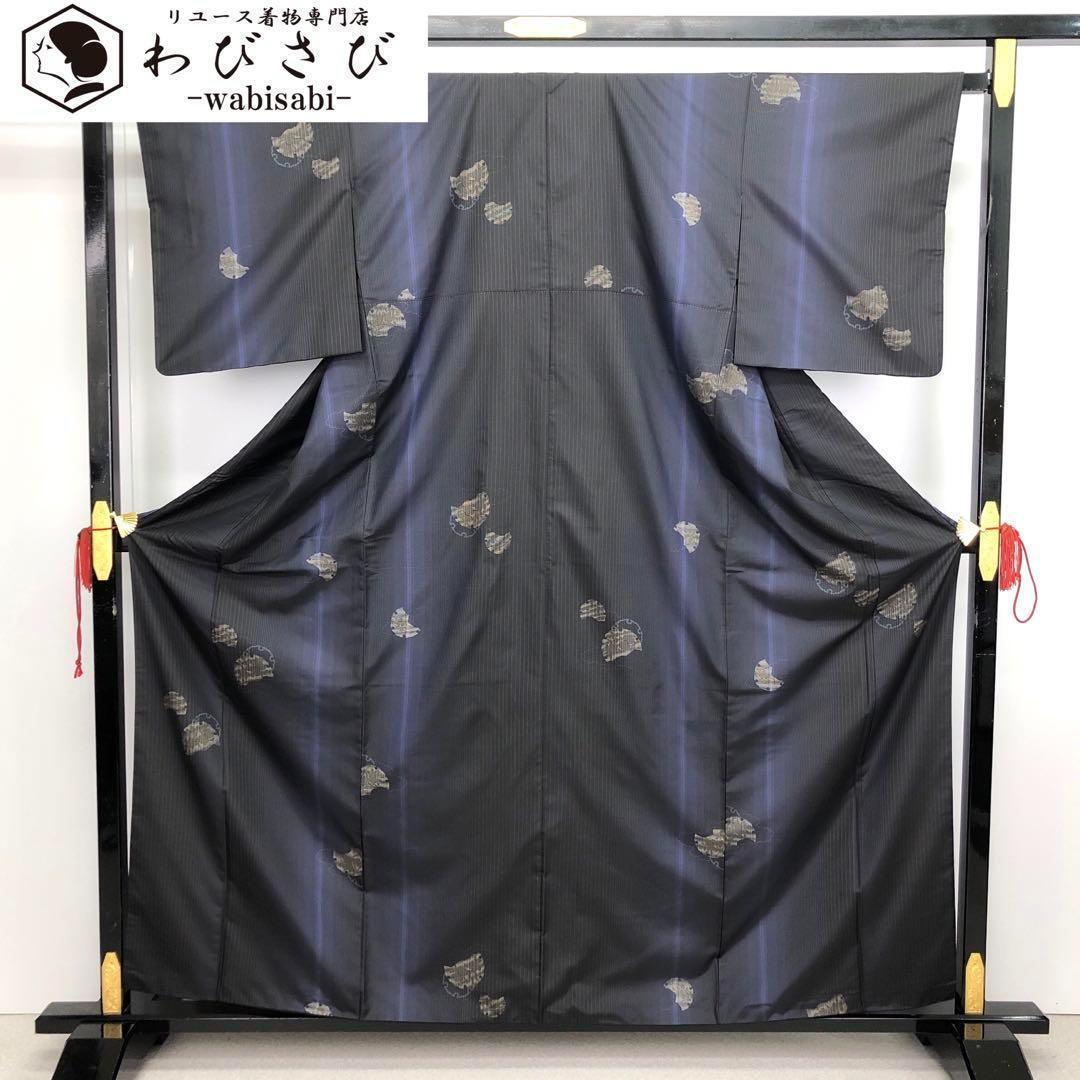 > 本場大島紬 染大島 黒地に縦縞模様 雪輪紋 ガード加工 K-3209 着物 きもの kimono 和服 和装 中古 リサイクル着物 【送料無料】
