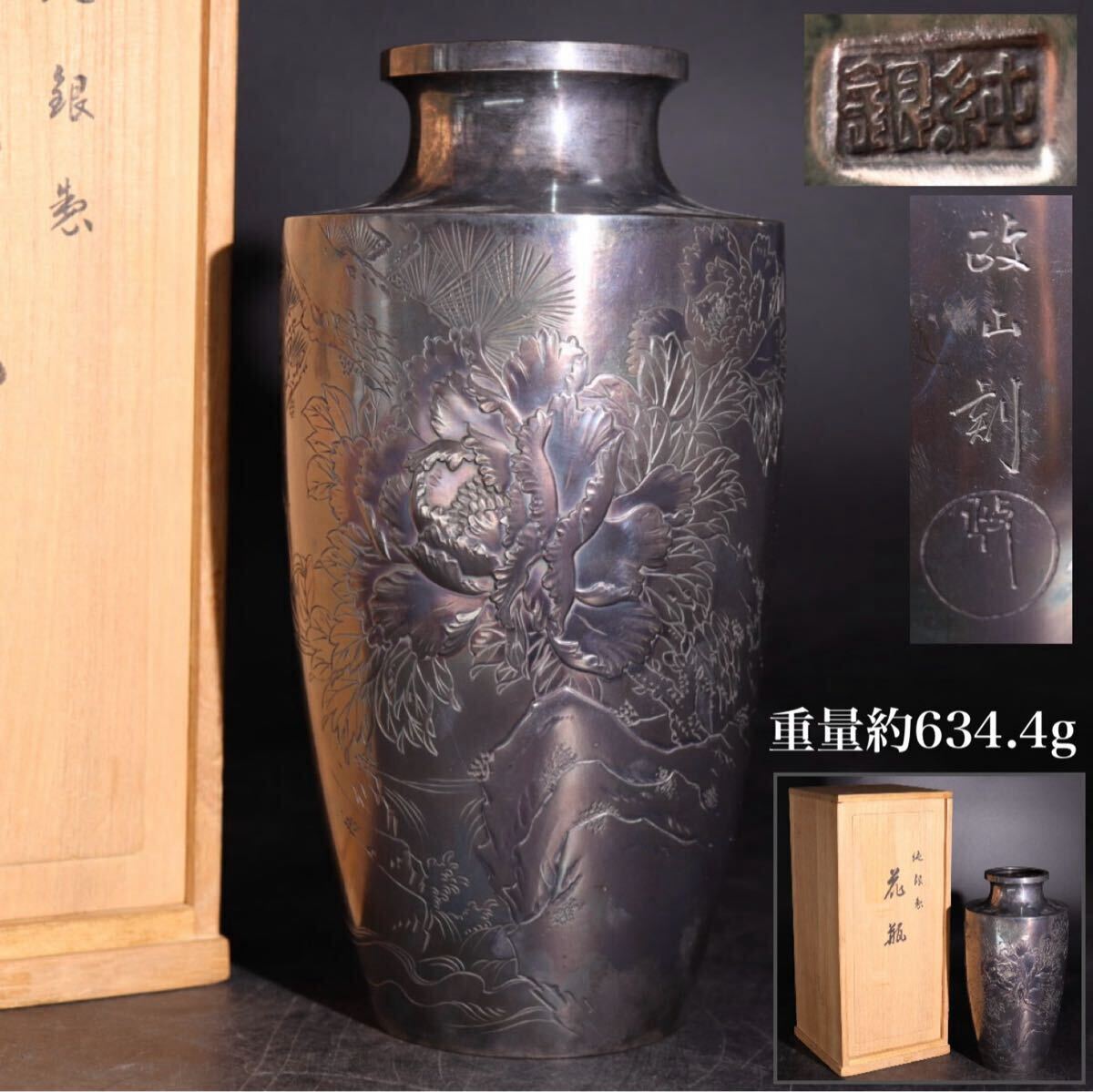 - 純銀 印刻 政山 刻 在銘 花文 花瓶 重量約634.4g 木箱付 / 銀 彫金 金工 花器 壺 煎茶飾 .G1980