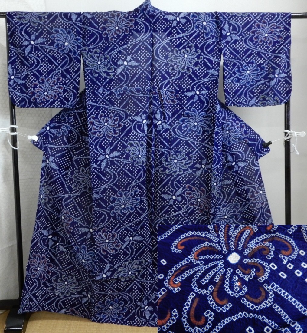- <銀の斧>木綿・本場有松絞り浴衣・三色の菊花に蝶々・裄丈69.5cm