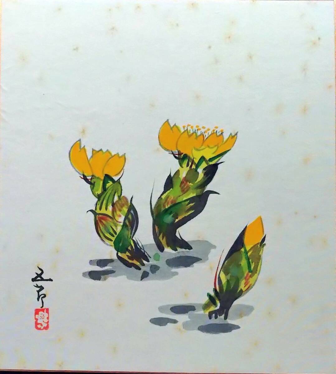 - f25071059〇直筆肉筆画 色紙 福寿草 梅酢五郎先生 揮毫画伯 昭和46年〇和本古書古文書