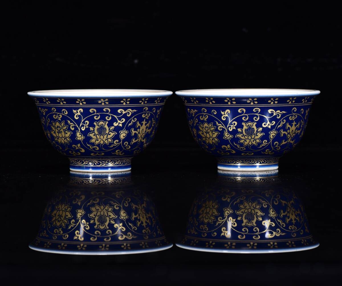 - ▽鴻▽ 明 永樂年製款 古陶瓷品 霽藍 描金 纏枝蓮紋 供碗一對 陶藝 古賞物 古董品 時代物 稀少珍品 中国古玩 中国古美術