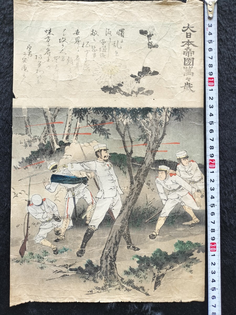 - 明治期/真作「大日本帝国万々歳」本物浮世絵木版画 武者絵 戦争絵 錦絵 大判 裏打ち