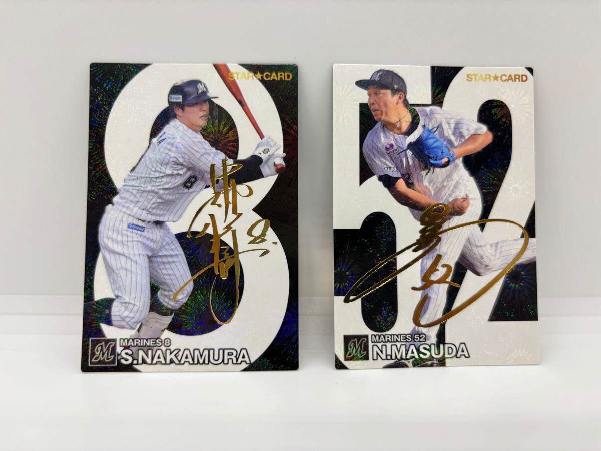 > 【金箔サイン入り】千葉ロッテマリーンズ 8番・中村奨吾 52番・益田直也 カルビー プロ野球チップス 2024