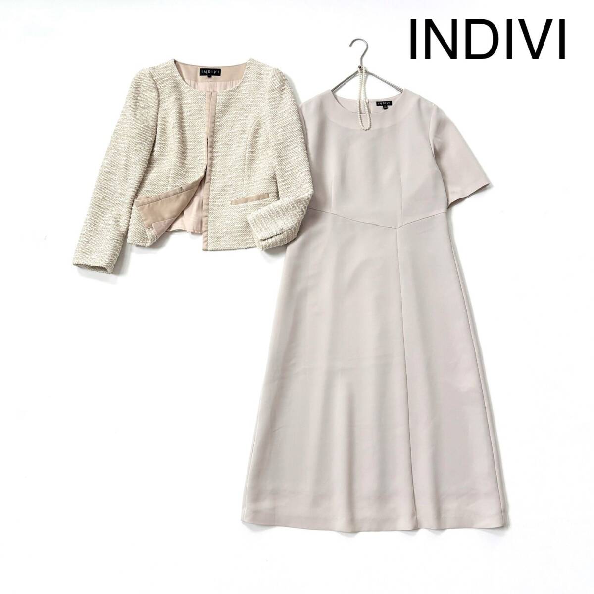 - yB95 INDIVI ツイードノーカラー ジャケット ツイードジャケット ラメ キラキラモール 前ホック