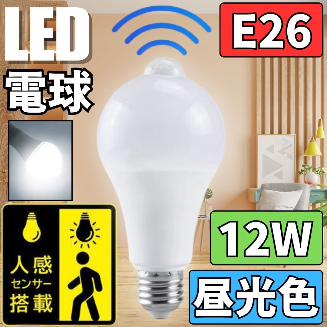 - LED電球 人感明暗センサー付 E26 12W 6500K 1個 昼光色ホワイト 明るさ80W相当 自動点灯 消灯 センサーライト 省エネエコ トイレ 廊下 玄関