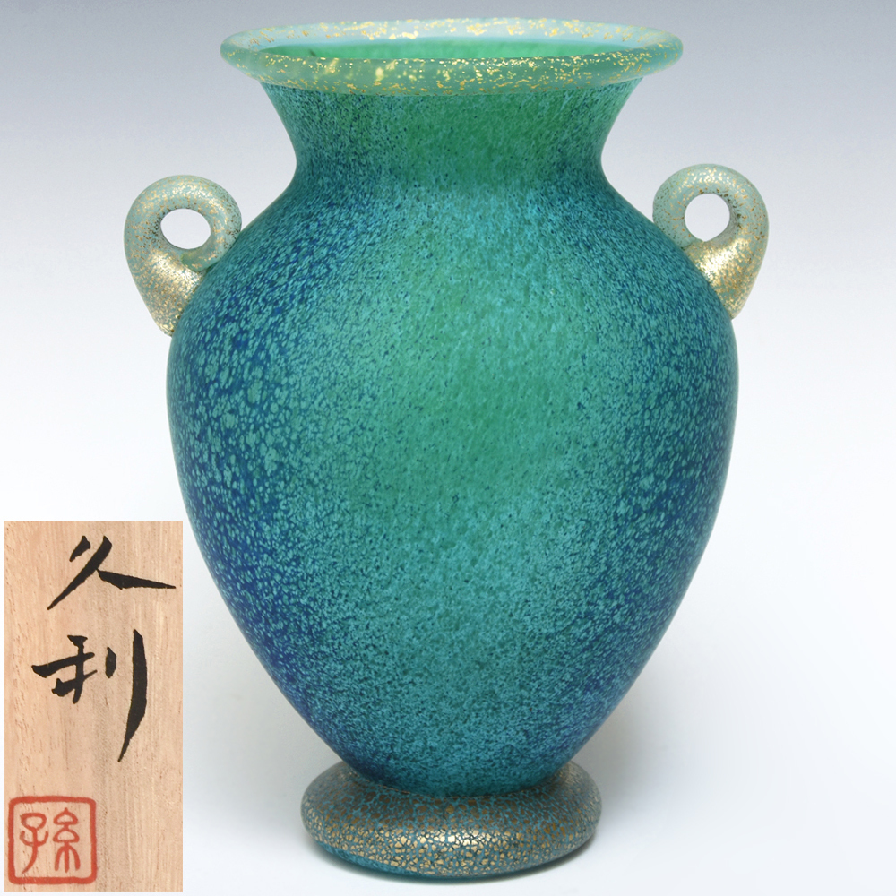 > 岩田久利 (造) 緑松 耳付 花瓶 共箱 金彩 しおり 花器 花入 花生 硝子 ガラス ガラス工芸 glass u0551a