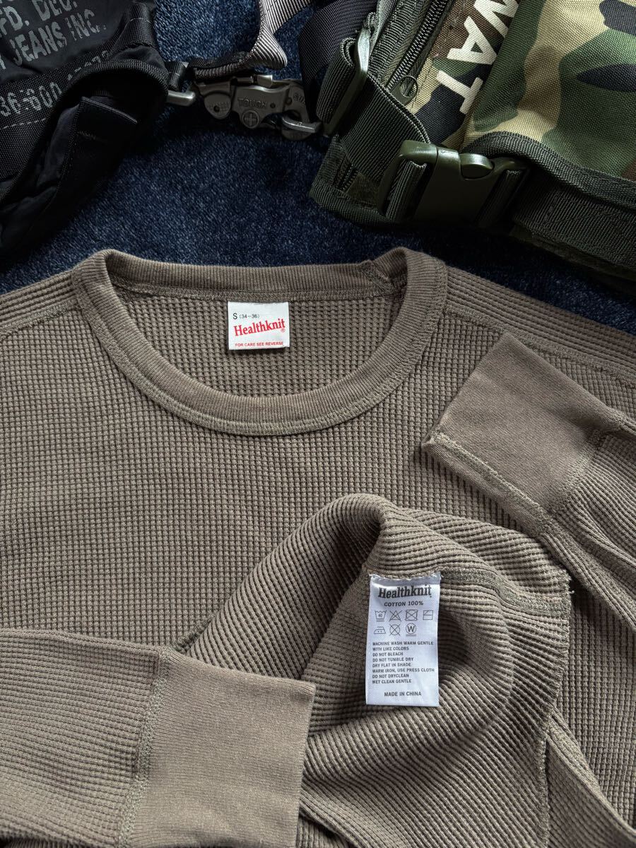 > 超美品 Healthknit ヘルスニット クルーネック ヘビーウエイト ワッフルサーマル素材 袖リブ仕様 ミリタリー 長袖シャツ sizeS(34-36)