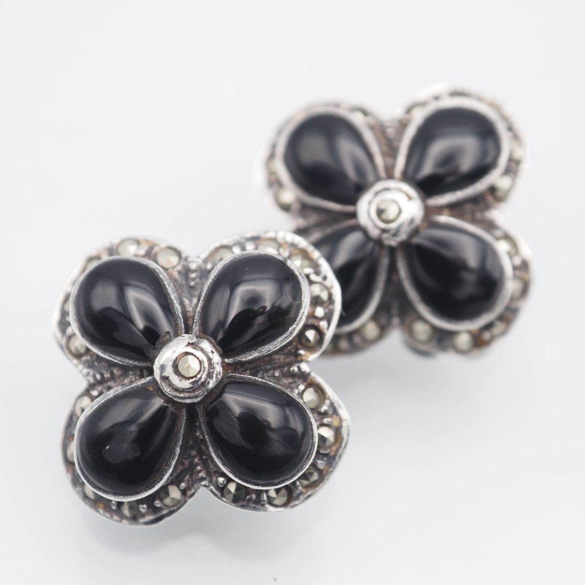 > B162 オニキス 925刻印 イヤリング マーカサイト マルカジット フラワー デザイン シルバー ヴィンテージ