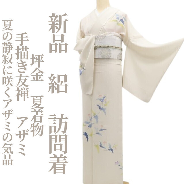 > tomihisa 新品 絽 坪金 手描き友禅 アザミ 夏着物 仕付け糸付 正絹”夏の静寂に咲くアザミの気品”訪問着 6308