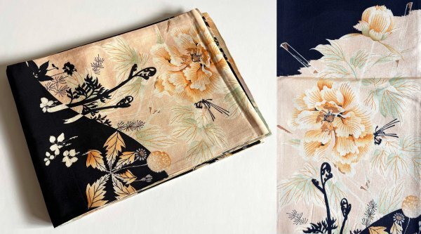 - KIRUKIRU アンティーク 昼夜帯 染 生成り×黒地にシャクヤクやたんぽぽ ワラビ レトロ 大正ロマン 着物 着付け 和装 古布 古裂