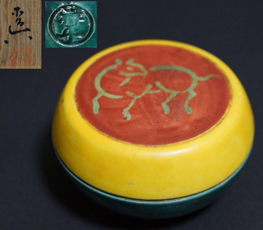 - 【芸】茶道具 京焼 晋六造 交趾焼色絵『馬文』丸香合★時代物★6D0604