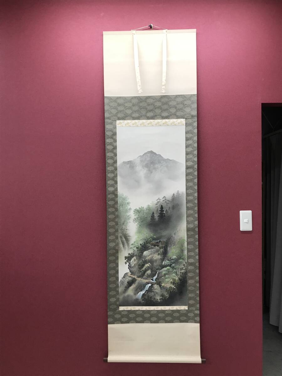 - DG8387 【真作】掛軸 岩井信英『彩色山水』絹本 掛け軸 落款 日本画 共箱 紙箱